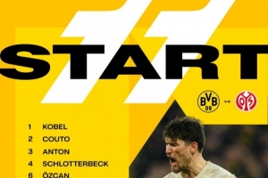 多特首发:1-科贝尔,2-扬-库拖,3-安东,4-施洛特贝克,6-厄兹詹,10-布兰特,13-格罗斯,14-拜尔,23-埃姆雷詹,26-莱尔森,27-阿德耶米